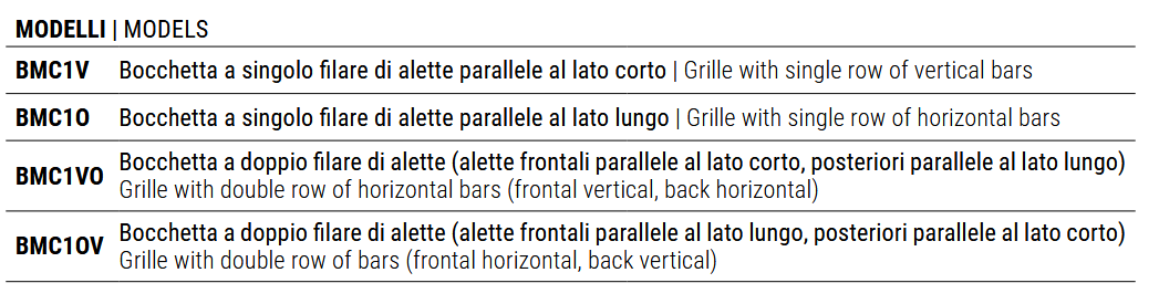 BxH [mm] Condotto di installazione Ø[mm] BMC1VO | BMC1OV BMC1V | BMC1O