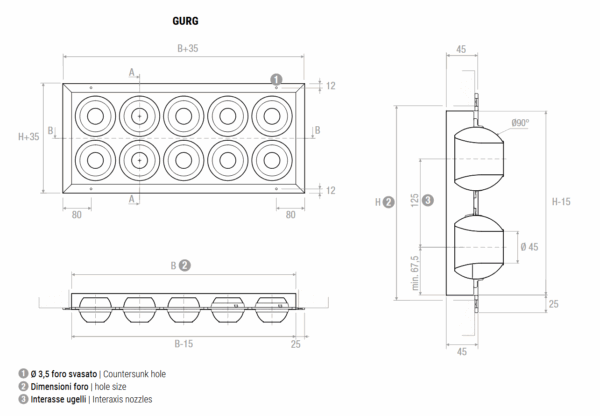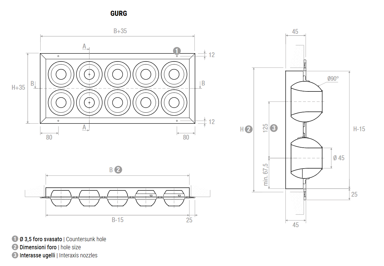 Diffusori a ugelli orientabili su pannello rettangolare.