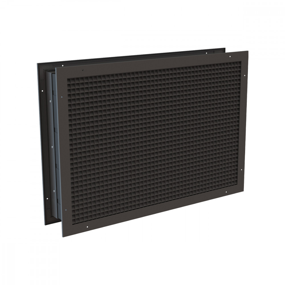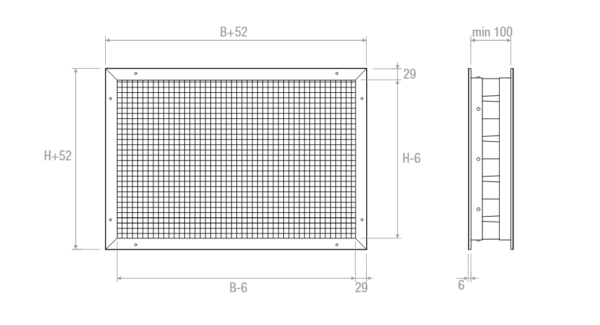 griglia tagliafuoco adatta per installazione interna. Testata secondo EN 1364-5-2017 e EN 1363-1:2012. Griglia ad ampia superficie di passaggio aria. Costruzione: