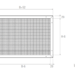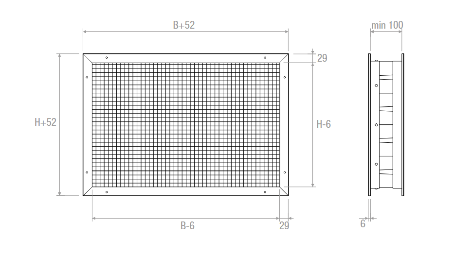 esecuzione con doppia griglia esterna a maglia quadra in alluminio con cornice ed elemento interno intumescente e termo-espandente. Supporto minimo di installazione: