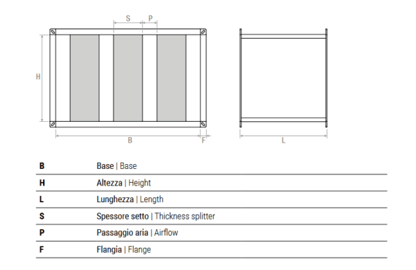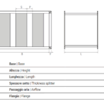 | BxH [mm] | Superfice netta di passaggio aria [mq] | Setti [N°] | L.600 | L.900 | L.1200 | L.1500 | L.1800 | L.2100 |