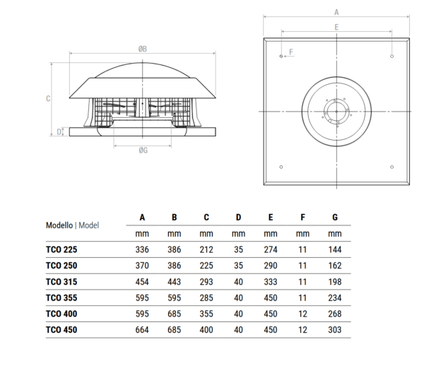 itorrini centrifughi a scarico orizzontale della serie TCO sono realizzati in lamiera di ferro verniciata a polvere con girante in acciaio zincato. Essi rappresentano una soluzione di massima funzionalità e silenziosità per piccoli e medi impianti di estrazione d’aria. La grande semplicità diinstallazione privileggia la loro applicazione intutte le situazioni di asèirazione aria non polverosa.