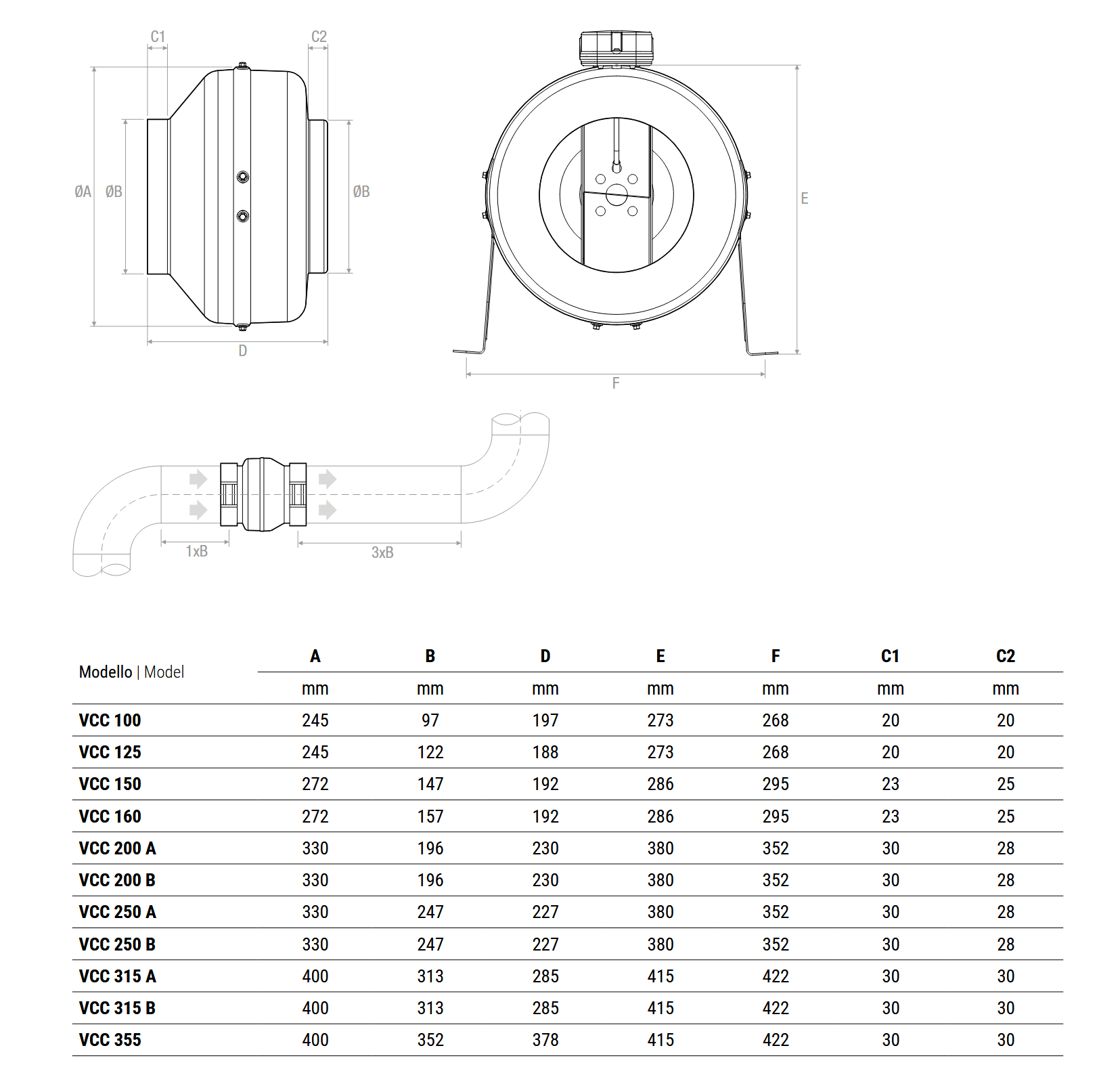 i ventilatori centrifughi in linea della serie VCC sono realizzati con cassa in lamiera di ferro verniciata a polvere e girate in acciao zincato. Il motore elettrico direttamente accoppiato è rappreddato direttamente dal fluido convogliato.