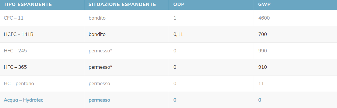 P3 ha anticipato di ben tre anni l’applicazione della normativa europea sull’uso dei gas CFC e HCFC, il cui impiego per i poliuretani rigidi PUR è fuorilegge dal 1° gennaio 2003. Il processo di espansione ad acqua consente di azzerare completamente l’ODP, il VOC (emissione di sostanze organiche volatili in atmosfera durante la produzione e la vita del pannello) e il GWP (global warming potential).