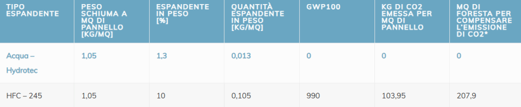 Con un più ampio studio LCA (Life Cycle Assessment) comparando gli impatti ambientali (in termini di GWP100) dei differenti tipi di canale aria disponibili. Valutando l’impatto in termini di kg di CO2 equivalente emessa per la produzione di 1 mq di pannello sandwich sp. 20,5 mm, a parità di densità e considerati gli espandenti utilizzati principalmente nella produzione di pannelli sandwich in poliuretano espanso rigido destinati al mercato dei canali preisolati in alluminio, si ottiene (valori indicativi):