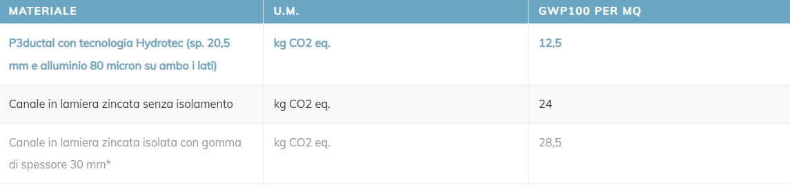 Per convenzione l’unità funzionale della lamiera zincata è il kg, mentre il canale in pannello viene commercializzato in mq. Considerando una lamiera zincata di spessore 8/10 mm e i relativi accessori per la costruzione del canale, il fattore di conversione peso/superficie risulta circa 8. Pertanto considerato che un kg di lamiera zincata risulta avere un GWP100 pari a 3 (fonte IISI, EPD) e applicando il fattore di conversione, si ottiene che il contributo a mq in termini di GWP100 è 24. Per quanto riguarda l’isolamento tipico per un canale in lamiera zincata (gomma), si può stimare un contributo in termini di GWP100 pari a 4,5 al mq calcolato sulla base della fonte Boustead Model che stima in 3 il contributo al kg della gomma stessa. Ciò premesso si ottiene la seguente tabella di confronto: