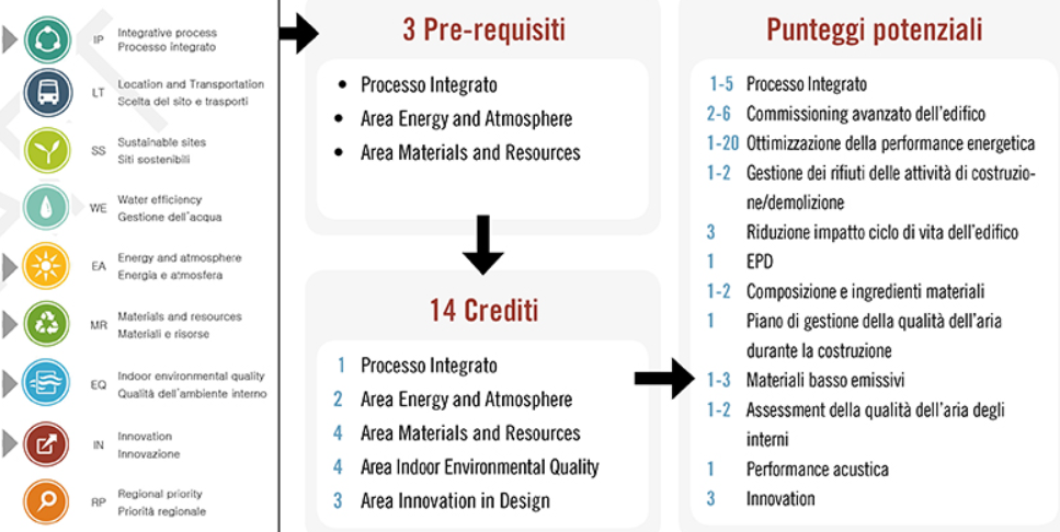 La certificazione degli edifici LEED è supportata da una checklist, suddivisa tra PREREQUISITI, obbligatori per il conseguimento della certificazione, e CREDITI, opzionali e a scelta del team di progettazione, suddivisi in aree tematiche. La versione V4 della certificazione si basa su una struttura di crediti che comprende nove aree tematiche. La certificazione LEED è costituita da una check list, suddivisa tra PREREQUISITI, obbligatori per il conseguimento della certificazione, e CREDITI, opzionali e a scelta del team di progettazione, suddivisi in aree tematiche.